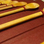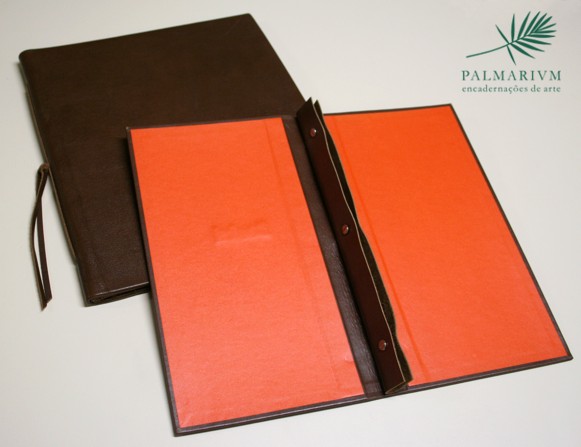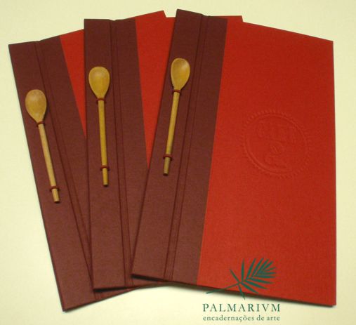 Cardápio em couro flexível. Sistema interno de elástico e colher para segurar conteúdo e tira de couro na lombada.