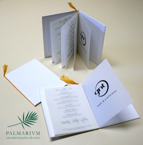 Cardápio com pinos aparentes, revestimento em tecido, impressão em serigrafia e baixo relevo com impresso colado.